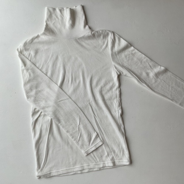 ▼品名 : タートルネックTシャツ ▼品番 : 42883 ▼素材 : 綿-100% ▼サイズ :フリー(身巾40cm 身丈64cm) インナーにぴったり◯ 綿100%のタートルネックTシャツ ニットやブラウス、プルオーバーなどの下に忍ばせて、 寒い冬を乗り越えるのに打ってつけのインナーカットソーTシャツが出来ました。 なんといっても肌触りがふわふわで心地良いので 素肌への不快感が少ないのが特徴です。 布が2枚重なった接結生地は、 少し空気を含んだような柔らかさと暖かさが感じられます。 こちらは首元までしっかり暖かいタートルネックタイプ 形違いのUネックTシャツ【43016】とタンクトップ【43015】とメローボトル【43067】もあります。 ※お取り扱い上のご注意 生地の特性上、 ソフト感のあるナチュラルな仕上げをしておりますので、 洗濯の際多少縮むことがあります。 ご了承くださいませ。